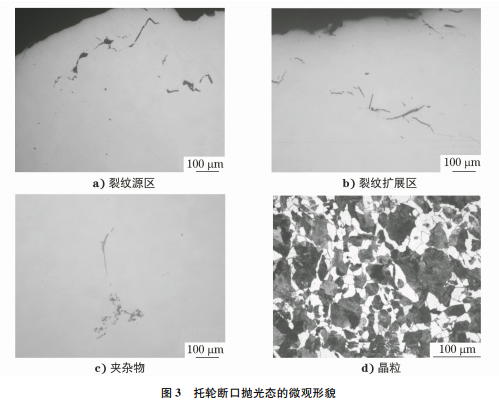 在托輪斷口裂紋處取樣,拋光后進(jìn)行金相檢驗(yàn), 結(jié)果如圖3所示。由圖3可知:裂紋源區(qū)有裂紋、孔 洞等缺陷;裂紋擴(kuò)展區(qū)可見二次裂紋;依據(jù) GB/T 8493—1987《一般工程用鑄造碳鋼金相》進(jìn)行評定, 可知夾雜物等級為5級,基體晶粒度等級為8.5級。