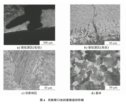 托輪斷口處的顯微組織形貌如圖4所示,可知 裂紋源區(qū)的組織為萊氏體+馬氏體+貝氏體,裂紋 源區(qū)有焊接組織、焊接缺陷、微裂紋等;熱影響區(qū)的 組織為貝氏體+馬氏體;基體組織為珠光體+鐵 素體。