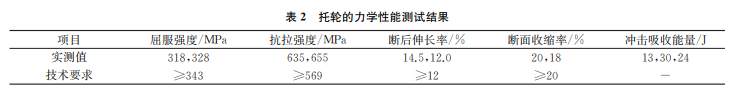 對托輪進(jìn)行力學(xué)性能測試,結(jié)果如表2所示,可 見托輪的屈服強(qiáng)度和斷面收縮率不滿足技術(shù)要求, 托輪的沖擊吸收能量較低,且波動較大。