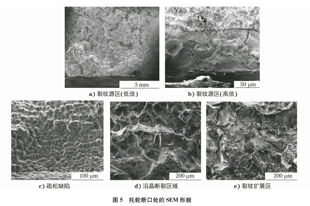 托輪斷口處的SEM 形貌如圖5所示,可見裂 紋源區(qū)有疏松缺陷,且分布有較大的氣孔,疏松缺陷區(qū)域的寬度約為1mm;沿晶斷裂區(qū)域緊鄰疏松缺 陷區(qū)域,該區(qū)域的晶粒較小;裂紋擴(kuò)展區(qū)域呈典型的 準(zhǔn)解理特征形貌。