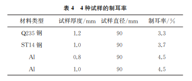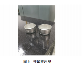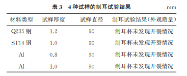 每組試驗(yàn)采用3個(gè)試樣,經(jīng)制耳試驗(yàn)后,圓片試 樣變成了杯試樣(見圖3),檢驗(yàn)制耳杯的外觀質(zhì)量, 具體結(jié)果如表3所示。然后一一測(cè)量制耳谷和制耳 峰的高度,計(jì)算材料的制耳率,具體如表4所示。