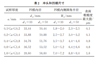 標(biāo)準(zhǔn)對(duì)試驗(yàn)設(shè)備進(jìn)行了相關(guān)規(guī)定,包括對(duì)沖壓 速率、壓邊力、定位裝置、沖頭和凹模的尺寸組合、粗 糙度的技術(shù)要求。根據(jù)金屬薄板和薄帶的厚度規(guī) 格,沖頭和凹模的尺寸按照表2[沖頭直徑為33mm 時(shí),沖頭圓角半徑R1 為(3.30±0.05)mm;沖頭直 徑為 50 mm 時(shí),沖 頭 圓 角 半 徑 R1 為 (5.00± 0.05)mm]的規(guī)定進(jìn)行選擇(產(chǎn)品標(biāo)準(zhǔn)或雙方協(xié)議 中另有規(guī)定的除外)。