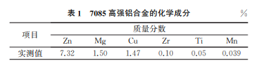 試驗材料為7085高強(qiáng)鋁合金鑄錠,熱處理狀態(tài) 為T7651態(tài),其化學(xué)成分如表1所示。7085高強(qiáng)鋁 合金的顯微組織為α(Al)相+彌散相+化合物相,晶粒度為4.5級。