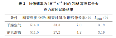 設(shè)置拉伸速率為10-6s-1,在35℃的充氫溶液 和35℃的干燥空氣下進(jìn)行試驗,結(jié)果如表2所示。 由表2可知:兩種條件下試樣的斷裂強(qiáng)度和斷裂時 間相近,但是在充氫環(huán)境下,材料的斷后伸長率有所 降低。通過計算,在拉伸速率為10-6s-1 時,7085 高強(qiáng)鋁合金的ISSRT 為3.19%,相對較低,說明材料 沒有明顯的應(yīng)力腐蝕開裂傾向。
