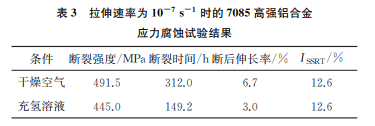 設(shè)置拉伸速率為10-7s-1,7085高強(qiáng)鋁合金在 35℃充氫溶液和35℃干燥空氣下的試驗結(jié)果如表 3所示。由表3可以看出:在35℃充氫溶液中,試 樣的斷裂強(qiáng)度、斷裂時間以及斷后伸長率與35℃空氣中試樣相比均有較大的降低。通過計算,在拉伸 速率為10-7 s-1 時,7085高強(qiáng)鋁合金的ISSRT 為 12.6%,相對較高,有明顯的應(yīng)力腐蝕開裂傾向。