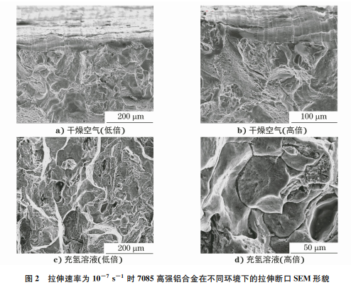 設(shè)置拉伸速率為10-6s-1,7085高強(qiáng)鋁合金在 不同環(huán)境下的拉伸斷口SEM 形貌如圖1所示。由 圖1可知:兩種環(huán)境中的7085高強(qiáng)鋁合金拉伸試樣 斷口的SEM 形貌相同,均表現(xiàn)為韌窩+沿晶+脆 性相斷裂特征。該材料在10-6s-1 拉伸速率下沒 有表現(xiàn)出明顯的應(yīng)力腐蝕敏感性。