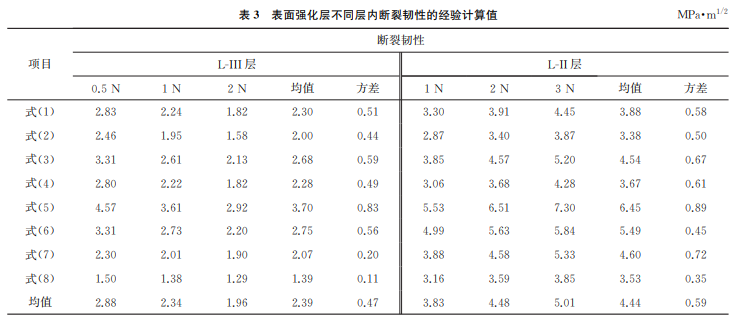 壓痕法計(jì)算斷裂韌性 KC 的公式如表 2 所 示[15-17](表2中,E 為彈性模量,P 為測(cè)試載荷,H 為硬度),其相應(yīng)的計(jì)算結(jié)果如表3所示。計(jì)算結(jié)果 表明:在不考慮裂紋屬性的情況下,通過(guò)8種公式計(jì) 算出的 L-II的KC 均高于 L-III。且隨著測(cè)試載荷 的提高,L-III內(nèi)相應(yīng)的KC 顯著下降。造成這種現(xiàn) 象的主要原因是隨著載荷的增加,邊緣效應(yīng)的影響 也顯著增加。