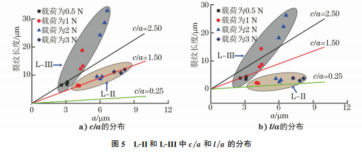 若想用壓痕法評(píng)價(jià)斷裂韌性,需先根據(jù)裂紋形 貌判斷裂紋類(lèi)型,再選擇適用的公式。在常規(guī)情況 下,依據(jù)裂紋長(zhǎng)度c(壓痕中心點(diǎn)至裂紋尖端的長(zhǎng) 度)或l(壓痕頂角至裂紋尖端的長(zhǎng)度)與a(壓痕的 半長(zhǎng)度)的比值大小,可判斷裂紋的類(lèi)型。對(duì)于多數(shù) 材料:當(dāng)c/a 小于2.5時(shí),為巴氏裂紋;當(dāng)c/a 大于 2.5時(shí),為中位裂紋;當(dāng)l/a 小于1.5時(shí),為巴氏裂 紋;當(dāng)l/a 大于1.5時(shí),為中位裂紋。L-II和 L-III 中c/a和l/a的分布如圖5所示。由圖5可知:在 表面方向,隨著載荷的增加,L-II內(nèi)c/a均小于2.5, 且l/a均小于1.5。因此,L-II內(nèi)壓痕頂角的裂紋為 巴氏裂紋。橫截面方向,L-III內(nèi)的c/a>2.5或l/a >1.5,因此L-III內(nèi)的裂紋為中位裂紋。