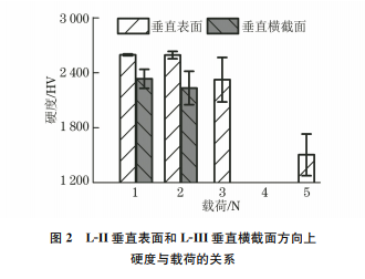 考慮到壓頭的尺寸效應(yīng)[12]以及壓痕的邊緣效 應(yīng),受表面強(qiáng)化層厚度的影響,從垂直表面方向測(cè)量 L-II的顯微硬度,從垂直橫截面方向測(cè)量L-III的顯 微硬度。L-II垂直表面和L-III垂直橫截面方向上 硬度與載荷的關(guān)系如圖2所示。由圖2可知:隨著 測(cè)試載荷的增加,L-II的顯微硬度均高于L-III的顯 微硬度。另一方面,隨著載荷的增加,L-II的顯微硬 度和L-III的顯微硬度均逐漸降低。理論上,載荷 越大,其他外在因素對(duì)硬度的影響越小,越能體現(xiàn)材 料的真實(shí)硬度。受強(qiáng)化層厚度的影響,在提高載荷 的同時(shí),還需要考慮邊緣效應(yīng)和基底效應(yīng)。采用觀 察壓痕的形貌、分析頂角裂紋和棱邊裂紋的擴(kuò)展行 為、測(cè)量裂紋長(zhǎng)度等方法,可以確定合適的測(cè)試載 荷,以獲得更接近實(shí)際的強(qiáng)化層硬度。