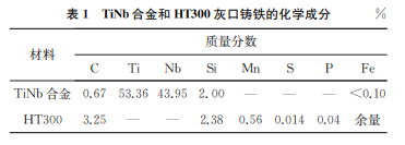 將TiNb合金和 HT300灰口鑄鐵通過(guò)緊密貼 合的方式,在有氬氣氣氛保護(hù)的管式爐內(nèi)進(jìn)行等溫 擴(kuò)散處理(1150℃,8h),這兩個(gè)材料的化學(xué)成分如 表1所示。利用碳原子的高擴(kuò)散速率,在濃度梯度 的驅(qū)使下,碳原子以擴(kuò)散的方式進(jìn)入 TiNb合金表 面,并發(fā)生原位固相擴(kuò)散反應(yīng),在 TiNb基體表面形 成(TiNb)C強(qiáng)化層。