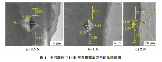 在不同載荷下,垂直橫截面方向 L-III的壓痕 形貌如圖4所示。經(jīng)過(guò)多點(diǎn)測(cè)量和觀察,L-III壓 痕的長(zhǎng)度和尖端裂紋長(zhǎng)度明顯大于 L-II,而且 LIII內(nèi)的裂紋主要沿平行于表面的方向擴(kuò)展。這主 要是由強(qiáng)化層厚度引入的邊緣效應(yīng)引起的。當(dāng)載 荷為0.5N時(shí),L-III內(nèi)壓痕的裂紋長(zhǎng)度波動(dòng)最小; 當(dāng)載荷為1N時(shí),壓痕半長(zhǎng)度的波動(dòng)最小[見(jiàn)圖4 b)]。進(jìn)一步考慮到邊緣效應(yīng),當(dāng)載荷為1N 時(shí), 顯微硬度可作為 L-III的最可信硬度,其平均硬度 為2334.88HV。結(jié)果表明,雖然 L-III組織中的 晶粒具有更小的尺寸,為亞微米級(jí),但是 L-II呈現(xiàn) 出較高的硬度。