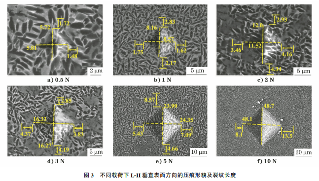 不同載荷下,L-II垂直表面方向的壓痕形貌及 裂紋長(zhǎng)度如圖3所示。在載荷為0.5N 時(shí),壓痕周 圍裂紋較少,部分壓痕尖端還未有明顯的裂紋出現(xiàn) [見(jiàn)圖3a)]。隨著載荷的增加,壓痕頂角裂紋逐漸 明顯且變長(zhǎng);同時(shí),棱邊裂紋也逐漸明顯[見(jiàn)圖3 d)],逐漸展現(xiàn)出相框裂紋的具體特征。相框裂紋的 產(chǎn)生原因?yàn)楦咻d荷下的高接觸應(yīng)力[13]和基底效應(yīng)。 當(dāng)載荷提高至10N時(shí),相框裂紋從棱邊延伸至壓痕 中心點(diǎn),呈龜裂狀。造成這種現(xiàn)象的主要原因是強(qiáng) 化層和基體所組成的“硬殼-軟底”結(jié)構(gòu)。在高應(yīng)力 下,硬殼將應(yīng)力傳送至基體層,但軟質(zhì)基體層強(qiáng)度不 足,會(huì)發(fā)生較大的變形,進(jìn)而導(dǎo)致表面強(qiáng)化層發(fā)生崩 塌,形成如圖3f)所示的相框裂紋。此時(shí),由于應(yīng)力 傳遞已經(jīng)與基體關(guān)聯(lián),并不能反映強(qiáng)化層的實(shí)際硬 度。因此,結(jié)合壓痕形貌和裂紋擴(kuò)展方式,可以判斷 L-II測(cè)試時(shí)的臨界載荷為3N。由于當(dāng)載荷為3N 時(shí),壓痕棱邊已經(jīng)有相框裂紋形成,因此當(dāng)載荷為 2N時(shí),所測(cè)顯微硬度為 L-II的最可信硬度,其平 均硬度為2594.13HV。