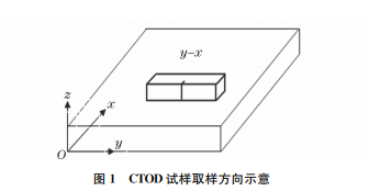 試驗(yàn)材料板厚為25 mm,材料為12Cr1MoV 鋼。按照3個(gè)測試標(biāo)準(zhǔn)中相互取交集的部分進(jìn)行斷 裂韌度CTOD試樣的加工制備、疲勞裂紋的預(yù)制及 試驗(yàn),CTOD試樣為3點(diǎn)彎曲矩形試樣,取樣方向 為y-x 方向,x 為鋼板的主變形方向,y 為橫向,與 板寬度方向重合,z為鋼板的最小變形方向,與板厚 方向重合。試樣的厚度B、寬度W 分別為25mm 和50mm,試樣長度為 230mm,試驗(yàn)跨距 S 為 200mm,試樣未開側(cè)槽。CTOD 試樣取樣方向如 圖1所示。
