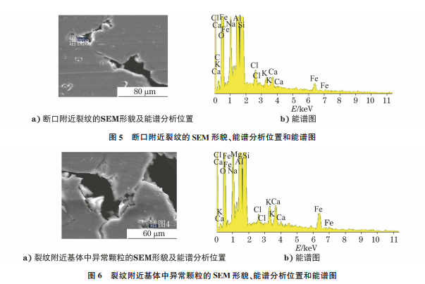 在裂紋附近的基體中發(fā)現(xiàn)異常顆粒,顆粒物的 Si、Fe元素含量較高,還有 Cl、K、Na等異常元素。 其SEM 形貌、能譜分析位置和能譜圖如圖6所示。