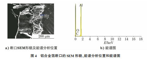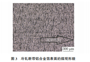 冷軋斷帶鋁合金箔表面的微觀形貌如圖3所 示,由圖3可知,垂直于軋制方向出現(xiàn)了很多條裂 紋,長(zhǎng)度不一致,深度沒(méi)有貫穿鋁合金箔的厚度。