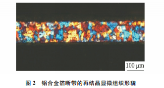 在箱式退火爐中對(duì)軋制態(tài)的鋁合金箔進(jìn)行再結(jié) 晶退火,退火溫度為300℃,保溫時(shí)間為2h,推斷原 始組織對(duì)材料韌性的影響。鋁合金箔經(jīng)過(guò)再結(jié)晶退 火,形成再結(jié)晶組織,在光學(xué)顯微鏡下觀察,鋁合金 箔斷帶的再結(jié)晶顯微組織形貌如圖2所示,其平均 晶粒尺寸為48μm。