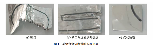 某鋁合金箔斷帶的宏觀形貌如圖1所示。由圖 1可知:斷帶斷口附近有縱向裂紋,斷帶上有點(diǎn)狀 缺陷。