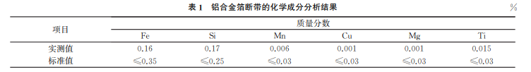 對(duì)鋁合金箔斷帶的化學(xué)成分進(jìn)行分析,結(jié)果如 表1所示。由表1可知,其化學(xué)成分分析結(jié)果符合 標(biāo)準(zhǔn) GB/T3190—2020 《變形鋁及鋁合金化學(xué)成 分》要求。