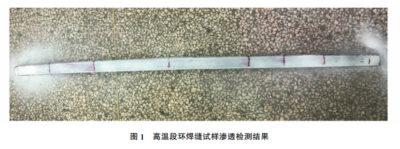 截取高溫段環(huán)焊縫為試樣,依據(jù)NB/T47013.5— 2015《承壓設(shè)備無(wú)損檢測(cè) 第5部分 滲透檢測(cè)》標(biāo) 準(zhǔn),對(duì)試樣焊縫外表面裂紋區(qū)進(jìn)行滲透檢測(cè),結(jié)果如 圖1所示,其中4條裂紋未擴(kuò)展至管箱母材,其余裂 紋尖端均延伸至管箱母材,裂紋無(wú)分叉。