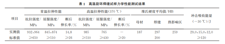 截取高溫段環(huán)焊縫制作力學(xué)性能測(cè)試試樣,分 別采用拉伸試驗(yàn)機(jī)、沖擊試驗(yàn)機(jī)和維氏硬度計(jì)對(duì)試 樣的拉伸、沖擊性能和硬度進(jìn)行測(cè)試,結(jié)果如表1所 示。由表1可知:焊縫的斷后伸長(zhǎng)率、沖擊吸收能量 不滿足標(biāo)準(zhǔn)對(duì)CM-A106N鋼的要求;焊縫、熱影響區(qū)的硬度偏高,管箱母材的硬度正常。說(shuō)明設(shè)備在 高溫服役過(guò)程中,金屬基體內(nèi)的雜質(zhì)元素逐漸析出, 偏聚于晶界,使焊縫材料的塑性變形能力和沖擊韌 性降低[2]。