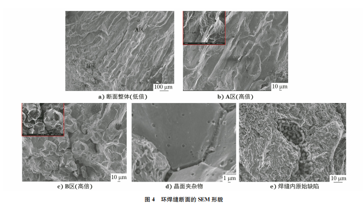 采用掃描電鏡(SEM)對(duì)環(huán)焊縫斷面進(jìn)行觀察, 結(jié)果如圖4所示。由圖4可知:斷面以沿晶開(kāi)裂特 征為主,存在二次裂紋,局部存在韌窩;A 區(qū)為焊縫 組織柱狀沿晶開(kāi)裂顆粒,B區(qū)為沿晶開(kāi)裂特征,焊縫 內(nèi)存在顆粒狀原始缺陷。從SEM 分析可知,裂紋 啟裂于焊縫外表面,晶面存在較多顆粒狀析出相。 根據(jù)此現(xiàn)象可斷定焊縫晶界的塑性變形能力較低。