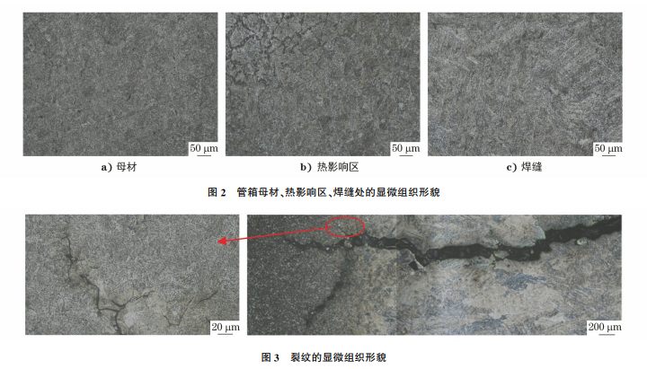 沿垂直于焊縫的縱截面截取試樣,拋光后采用 體積分?jǐn)?shù)為4%的硝酸乙醇溶液對(duì)其進(jìn)行腐蝕,采 用光學(xué)顯微鏡對(duì)其進(jìn)行觀察,結(jié)果如圖2~3所示。 由圖2~3可知:管箱母材顯微組織為貝氏體,熱影 響區(qū)顯微組織為馬氏體+貝氏體+鐵素體,焊縫顯 微組織為馬氏體+鐵素體+貝氏體,馬氏體為主要 組織,部分晶界存在析出相,主裂紋上有樹(shù)枝狀小裂 紋,為沿晶裂紋,焊縫區(qū)存在孤島、臺(tái)階狀的裂紋。 初步判斷,馬氏體的形成與焊后熱處理不符合要求 有關(guān)。