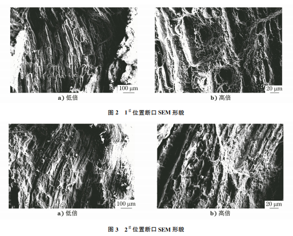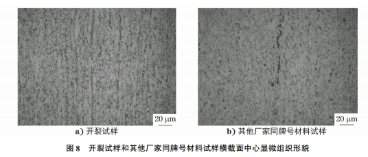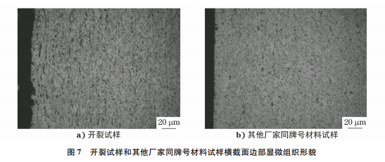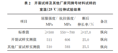 采用 ZWICKZ600型雙立柱萬(wàn)能材料試驗(yàn) 機(jī)對(duì)上述兩個(gè)試樣分別進(jìn)行力學(xué)性能測(cè)試,結(jié)果 如表2所示。開裂試樣的屈服強(qiáng)度、抗拉強(qiáng)度和 斷后伸長(zhǎng)率均符合 GB/T228.1—2010 《金屬材 料 拉伸試驗(yàn) 第一部分:室溫試驗(yàn)方法》的標(biāo)準(zhǔn)要 求。與其他廠家生產(chǎn)的同牌號(hào)材料相比,力學(xué)性 能無明顯差異。