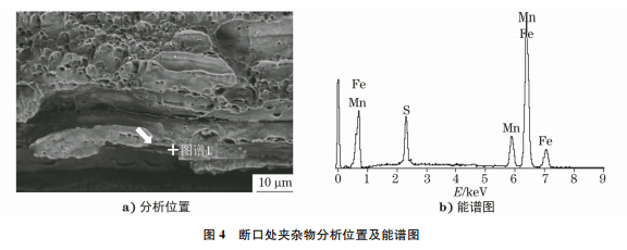 對(duì)零件沖壓開裂處進(jìn)行分析,在開裂斷口部位 的較大溝槽里發(fā)現(xiàn) MnS夾雜物。實(shí)際開裂零件中 硫元素含量顯著大于其他廠家材料。開裂試樣中的 錳元素含量較高,錳元素的偏析是鋼中產(chǎn)生帶狀組 織的主要原因。帶狀組織中分布著 MnS等非金屬 夾雜物,夾雜物與基體界面的結(jié)合力弱,易在變形時(shí) 產(chǎn)生裂紋。
