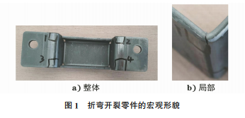 QSTE500TM 鋼是一種冷成型熱軋酸洗汽車 結(jié)構(gòu)鋼材料,是汽車業(yè)需要的新鋼種,具有較好的表 面質(zhì)量、厚度公差和加工性能,可用于車身覆蓋件及 冷軋板生產(chǎn)的汽車零部件,原材料成本可降低約 10%。某 QSTE500TM 鋼零件在沖壓過程中出現(xiàn) 折彎開裂,筆者采用宏觀觀察、化學(xué)成分分析、金相 檢驗(yàn)、掃描電鏡(SEM)和能譜分析等方法對(duì)零件的開裂原因進(jìn)行分析,以防止該類問題再次發(fā)生。