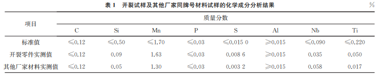 從化學(xué)成分上看,開裂試樣主要通過添加鈮元 素和鈦元素來進(jìn)行強(qiáng)化,其他廠家同牌號(hào)材料試樣 是通過添加鈮元素進(jìn)行強(qiáng)化。