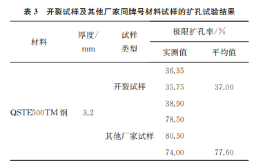 按照 GB/T15825.4—2008 《金屬薄板成形性 能與試驗(yàn)方法 第 4 部分:擴(kuò)孔試驗(yàn)》規(guī)定,采用 HET505型擴(kuò)孔試驗(yàn)機(jī)進(jìn)行擴(kuò)孔試驗(yàn),結(jié)果如表3 所示,發(fā)現(xiàn)開裂零件材料的擴(kuò)孔率比其他廠家同牌 號(hào)材料低40%。