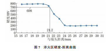 從斷口一側向內依次進行顯微硬度測試,根據 GB/T1172—1999《黑色金屬硬度及強度換算值》, 結合顯微硬度測試結果繪制淬火區(qū)硬度-距離曲線 (見圖7),可知淬火區(qū)深度約為21.2mm。