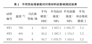 為了評估該零件在目前型號飛機上的穩(wěn)定性及 可靠性,掌握該材料熱處理后的各項性能,對襯筒材 料開展熱處理工藝試驗。分析不同熱處理工藝參數 對襯筒材料馬氏體等級、力學性能、沖擊性能等的影 響規(guī)律,試驗結果如表2所示。