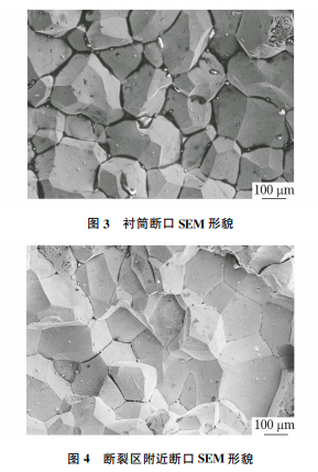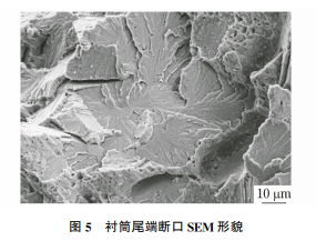 用掃描電子顯微鏡(SEM)對襯筒的斷口進行 分析,可見斷口為典型的沿晶特征(見圖3)。在軸 向距斷口約10mm處取樣,發(fā)現斷口形貌與原始斷 口形貌一致,呈沿晶特征(見圖4)。在襯筒尾端取 樣,斷口呈解理+韌窩形貌(見圖5)。