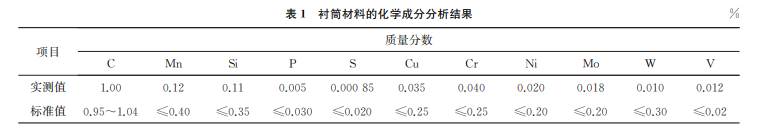 對襯筒材料進行化學成分分析,結果如表1所 示,由表1可知:襯筒材料滿足 GB/T1298—2008 《碳素工具鋼》對T10A鋼的要求。