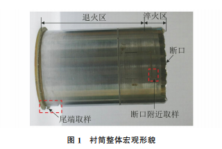 某襯筒零件材料為退火態(tài),其熱處理工藝為高 頻淬火+回火,襯筒的淬火區(qū)域為倒角端頭處下沿 20~25mm,硬度要求為60~63.3HRC,淬火區(qū)馬 氏體等級按照相關文件要求應不大于7級。筆者采 用一系列理化檢驗方法對該襯筒零件的斷裂原因進 行分析,以避免該類事故再次發(fā)生。