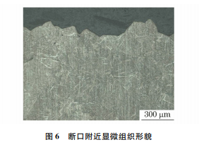垂直于斷口切取金相試樣,截面經磨拋、腐蝕 后,在光學顯微鏡下觀察,發(fā)現其顯微組織為較粗大的馬氏體,按相關工藝文件進行評定,針狀馬氏體評 級為10級(見圖6)。