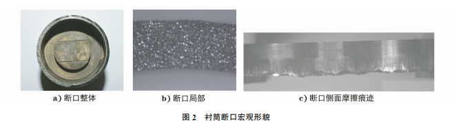 襯筒的斷裂區(qū)為端頭倒角區(qū),整個襯筒外表面 緊靠倒角區(qū)一周可見約5mm 寬的磨損痕跡,襯筒 整體宏觀形貌如圖1所示。襯筒的斷面粗糙,斷口 約占整個圓周的42%,其余部分為零件原始表面 (見圖2)。