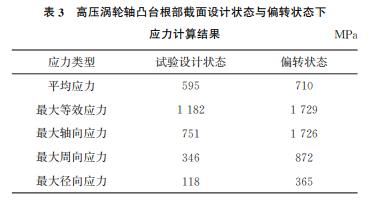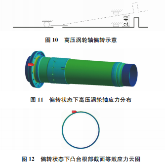 根 據(jù) 上、下 支 撐 板 軸 承 安 裝 孔 同 軸 度 為 4.98mm(上 支 撐 板 相 對(duì) 于 下 支 撐 板 軸 線 偏 離 2.49mm),高壓渦輪軸偏轉(zhuǎn)如圖10所示,對(duì)偏轉(zhuǎn)狀 態(tài)下的高壓渦輪軸進(jìn)行應(yīng)力分析(見圖11,12),高 壓渦輪軸最大應(yīng)力位置變?yōu)橥古_(tái)根部倒圓處,此時(shí) 凸臺(tái)根部倒圓位置截面平均應(yīng)力為710MPa,應(yīng)力集中系數(shù)為2.44;鎖片槽根部倒圓位置截面平均應(yīng) 力為634MPa,應(yīng)力集中系數(shù)為2.75。