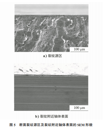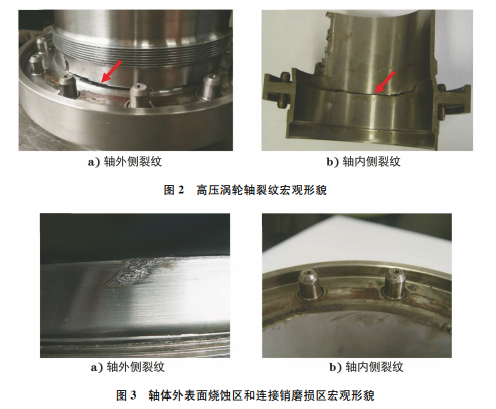 高壓渦輪軸的裂紋源區(qū)呈多源特征,源區(qū)軸體 表面的機(jī)械加工刀痕完整,在斷口上發(fā)現(xiàn)嚴(yán)重磨損 痕跡,軸體變形較大。高壓渦輪軸的化學(xué)成分分析 結(jié)果和力學(xué)性能測(cè)試結(jié)果均正常。
