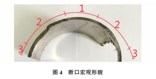 在裂紋處剖開試樣,可見斷面有兩種差異較大 的特征,斷面中部區(qū)域(區(qū)域1)平坦,該區(qū)域裂紋擴(kuò) 展路徑均沿軸體和端面臺(tái)階的圓周分布,該區(qū)域長(zhǎng) 度約為5cm,占裂紋長(zhǎng)度的1/4;斷面兩側(cè)區(qū)域(區(qū) 域2)起伏明顯,且可見沿圓周和壁厚方向的大應(yīng)力 撕裂特征,區(qū)域3為人工打斷區(qū)(見圖4)。