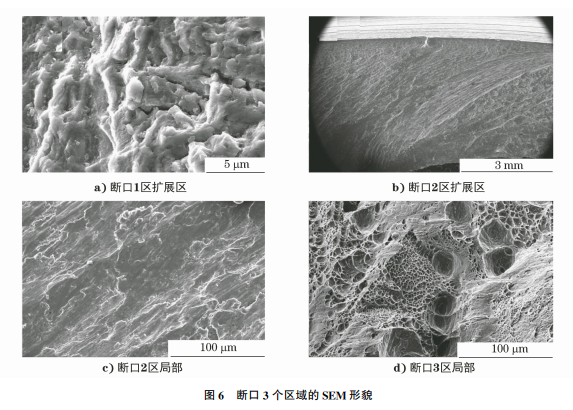斷口1區(qū)可見解理河流狀花樣,2區(qū)可見大應(yīng) 力撕裂快速擴(kuò)展和磨損特征,3區(qū)呈現(xiàn)韌窩特征。 斷口3個(gè)區(qū)域的SEM 形貌如圖6所示。