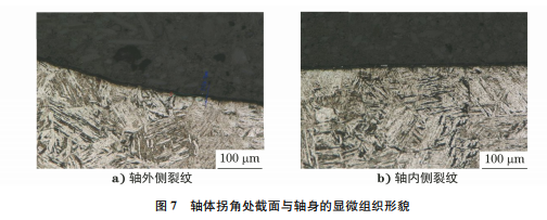 沿裂紋附近的拐角處縱向取樣,觀察拐角處截 面與軸身的顯微組織(見圖7),由圖7可知:材料的 顯微組織正常,為板條狀馬氏體。