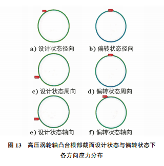 根據(jù)對(duì)比設(shè)計(jì)與偏轉(zhuǎn)狀態(tài)下的應(yīng)力分布,由于 彎矩載荷的存在,設(shè)計(jì)狀態(tài)下凸臺(tái)根部倒圓處截面 應(yīng)力分布不均勻,但差別不大,而受試驗(yàn)件偏轉(zhuǎn)的影 響,凸臺(tái)倒圓處應(yīng)力分布不均勻程度進(jìn)一步增大。 高壓渦輪軸凸臺(tái)根部截面設(shè)計(jì)狀態(tài)與偏轉(zhuǎn)狀態(tài)下各 方向應(yīng)力分布如圖13所示。高壓渦輪軸凸臺(tái)根部 截面設(shè)計(jì)狀態(tài)與偏轉(zhuǎn)狀態(tài)下應(yīng)力計(jì)算結(jié)果如表3 所示。