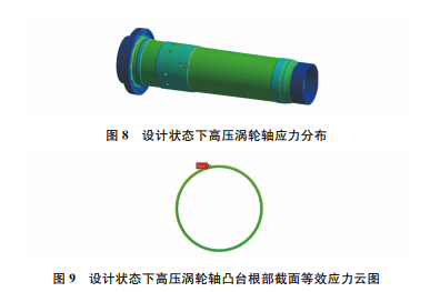 在試驗(yàn)設(shè)計(jì)狀態(tài)下,高壓渦輪軸等效應(yīng)力分布 如圖8,9所示,高壓渦輪軸最大應(yīng)力位置在鎖片槽 根部倒圓位置,此時(shí)凸臺(tái)根部倒圓位置截面的平均 應(yīng)力為595MPa,應(yīng)力集中系數(shù)為1.99;鎖片槽根部 倒圓位置截面平均應(yīng)力為593MPa,應(yīng)力集中系數(shù) 為2.47。
