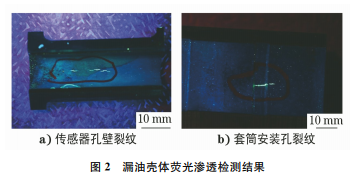 將故障舵機正常連接電纜和油路,在額定供油 狀態(tài)下正常接通舵機,舵機發(fā)生漏油。 切取漏油殼體傳感器孔和套筒安裝孔之間的孔 壁進行熒光滲透檢測,可見傳感器孔壁裂紋沿縱向 斷續(xù)分布,相應(yīng)套筒安裝孔環(huán)槽附近存在裂紋,結(jié)果 如圖2所示。殼體及孔壁無外力損傷及變形痕跡。