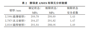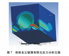 運用 ANSYS有限元分析軟件對殼體進行靜強 度仿真分析,殼體名義壁厚有限元應(yīng)力分析云圖如 圖7所示。額定工作狀態(tài)與極限工作狀態(tài)下殼體傳 感器與套筒安裝孔壁處的靜強度 ANSYS有限元分 析數(shù)據(jù)如表2所示。由表2可知:殼體靜強度滿足 設(shè)計規(guī)范要求;最大應(yīng)力部位為該殼體套筒安裝孔 相鄰的傳感器孔壁表面部位。