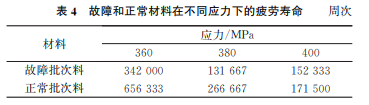 由測試數(shù)據(jù)可見:故障批次材料較正常批次材 料的疲勞壽命低,在360MPa和380MPa應(yīng)力水平 下,故障批次材料的疲勞壽命分別較正常批次材料 低48%和51%。