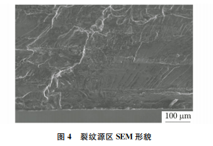 在裂紋處將殼體打開,可見斷口平坦、有光澤、 源區(qū)有 A和B兩個裂紋源,均位于傳感器孔壁,斷 口宏觀形貌如圖3所示。在掃描電鏡(SEM)下觀 察斷口,源區(qū)均可見輻射狀疲勞臺階(見圖4),裂紋 擴展區(qū)可見疲勞條帶(見圖5)。