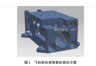 舵機殼體是飛機飛行控制系統(tǒng)的關(guān)鍵零件,其 套筒安裝孔內(nèi)安裝有活塞,在殼體內(nèi)脈沖油壓的作 用下,活塞往復(fù)運動。該殼體內(nèi)部油路縱橫交錯,工 作時承受0~21MPa的脈沖油壓作用。某型飛機 舵機殼體在服役過程中,傳感器孔和套筒安裝孔之 間的薄壁陸續(xù)出現(xiàn)裂紋,導(dǎo)致漏油。殼體裂紋部位 如圖1所示,圖中:1為備傳感器孔;2為主傳感器 孔;3為套筒安裝孔。